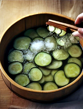 2. 소금에 절이기: 큰 용기에 오이를 층층이 쌓고, 각 층마다 천일염을 골고루 뿌립니다. 오이가 충분히 절여지도록 6~8시간 동안 둡니다.