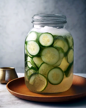 5. 발효하기: 절여진 오이를 꺼내어 물기를 제거하고, 깨끗한 유리병에 차곡차곡 담습니다. 병에 담긴 오이에 소금물을 부어 완전히 잠기게 한 후, 실온에서 1주일 정도 발효시킵니다.